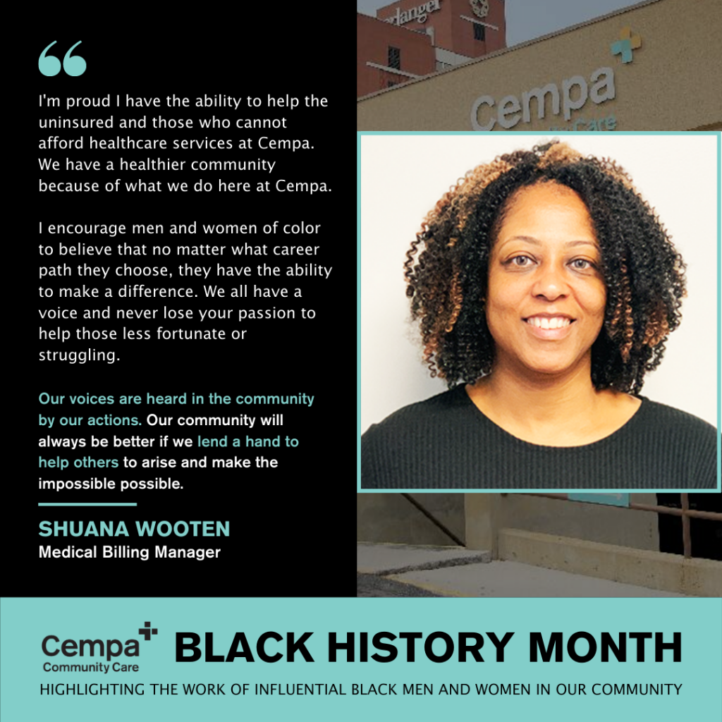 Shauna Wooten is #TeamCempa’s Medical Billing Manager and works hard to provide resources for clients who may not have insurance or limited funds to pay for medical services. She is a vital part of our organization and believes that lending a helping hand to others makes our community stronger!